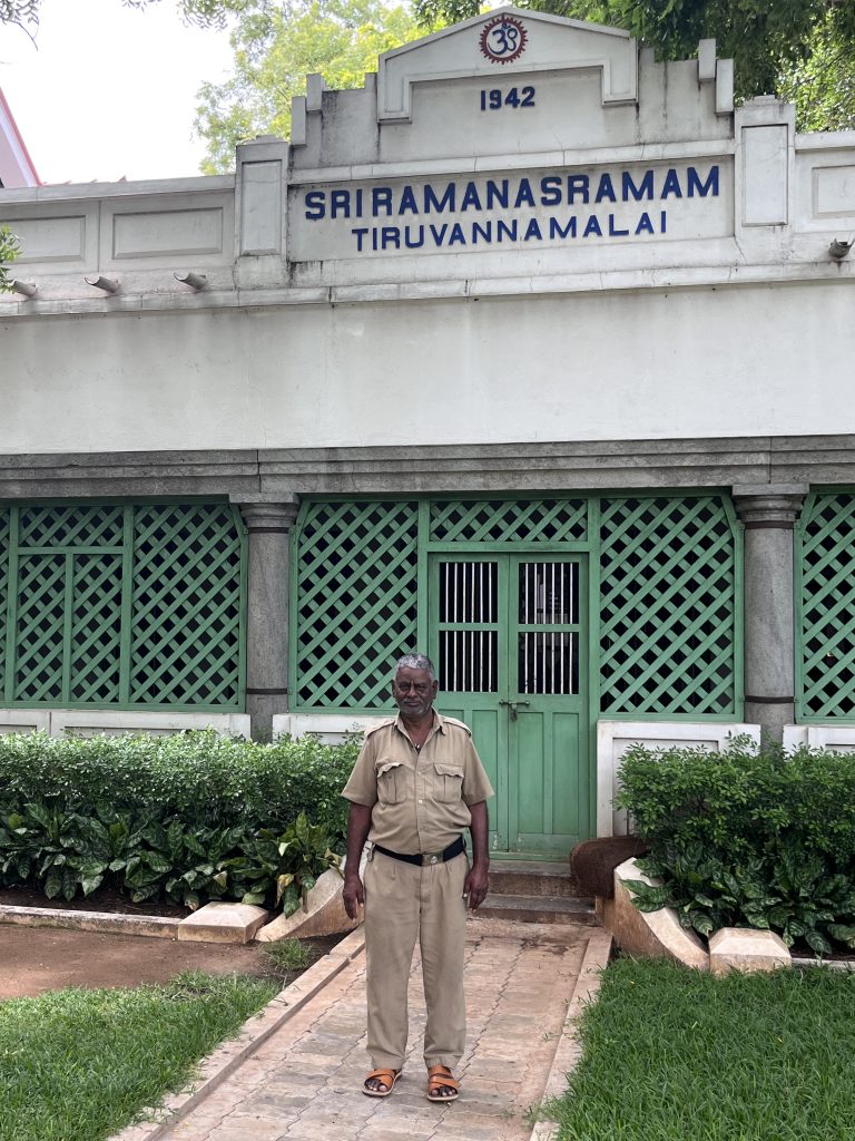 18th Aug 2025 - Ramanashramam, picture taken by the lovely guardian who only spoke Tamil and we communicated with body language. After he took a picture of me, he asked me to take a picture of him 🙂 and here it is, below. To show gratitude I used google translator from English to Tamil an typed "very beautiful", he read it, understood and laughed and even clapped! <3
