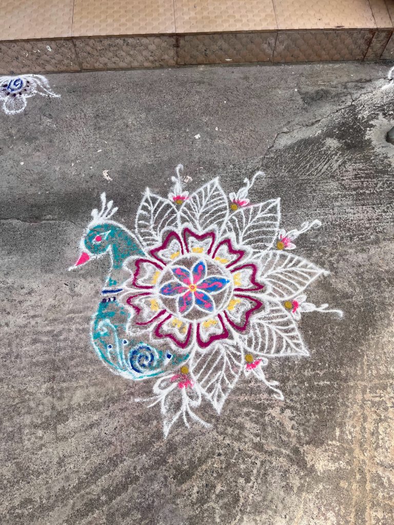 26th Aug 2025. Murga. Peacock. One of the amazing and very geometrical drawings that you can see on the ground, at the entrance of each house. A devotional practice / offering. This one was made by Tamil at 6am.