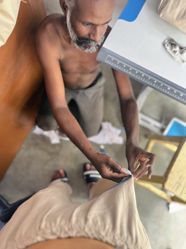 1st Sept 2025. My neighbour: Tailor Kumar. Taking measurements for my new pants made of organic handwoven and fair trade cotton.