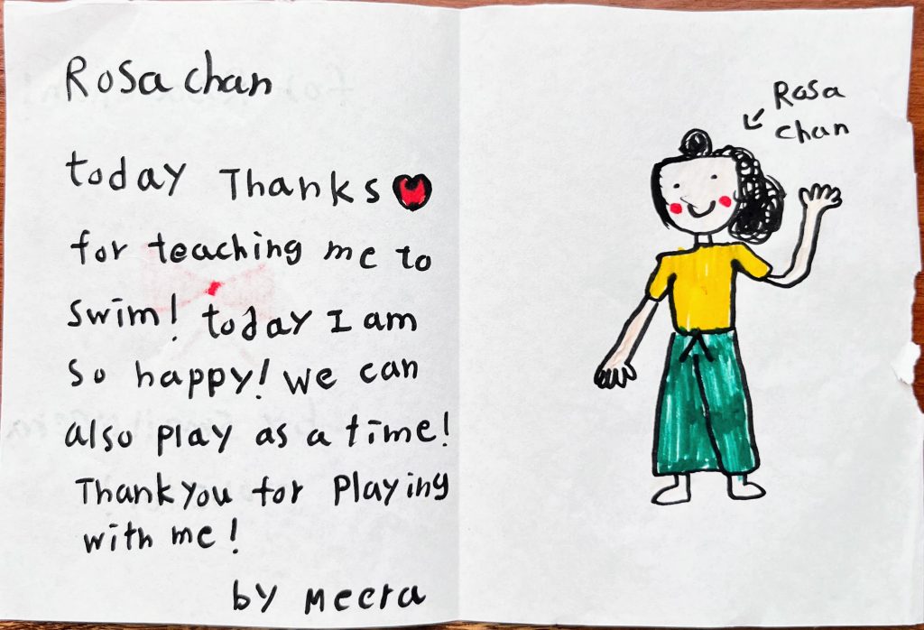 29 Sept 2025. Found in my doorstep this morning. By Meera (which means Ocean of Love) my 9 year old best friend in India (with the most loving Japanese mum and Indian dad). Google says: In Japanese, "chan" (ちゃん) is a diminutive and affectionate honorific suffix, typically used for young girls, children, and close friends, though it can also be applied to pets, romantic partners, or even beloved family members like a grandmother, signaling a cute and familiar relationship. Adding "-chan" to a name makes it sound cuter and more endearing, and it should be avoided in formal situations, professional settings, or when addressing someone with a higher social standing.
